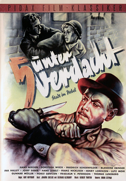 “In Fünf unter Verdacht (…) liebäugelt Kurt Hoffmann mit dem gothic crime eines Robert Siodmak“, schreibt Frank Stegemann über diesen bundesdeutschen Kriminalfilm des Jahres 1950, welcher als eine frühe Produktion der Central Cinema Company (CCC-Filmkunst) in Händen der Berliner Produzenten-Legende Artur Brauner mit Hans Nielsen gut besetzt ist. Tatsächlich kam der Film auch unter dem Langtitel Fünf unter Verdacht – Stadt im Nebel und als Mord in Belgesund in die Kinos, und es ist dieser Schleier der Feuchtigkeit, der in der Küstenstadt dem Tag sein Licht stiehlt und jede Nacht undurchdringlich werden lässt, was das Werk so sehr nach dem foggy old London “Made in Hollywood“ aussehen lässt, wie es Robert Siodmak in Unter Verdacht (USA 1947) und Douglas Sirk in Angelockt (USA 1947) exemplarisch inszeniert hatten. Im Zwielicht der Gaslaternen, in dem fortwährenden Dunkel aller Gassen und Hohlwege oder auch in demjenigen der Keller und Dachstuben, die als Verstecke und Rückzugsorte dienen, erweist sich Hoffmanns Film als atmosphärisch dicht und das sogar bis ins Finale. Zudem ist er ähnlich wie seine in London platzierten US-amerikanischen Vorbilder eines Film Noirs mit gotischem Dekor zwar in Dänemark angesiedelt, aber in Berlin gedreht. Herbert Molls Thomsen verhört die Prima (EA 1940) ist die Romanvorlage eines von Johanna Sibelius und von Eberhard Keindorff verfassten Drehbuchs, das seine beiden des Mordes am Hausmeister Palsberg Verdächtigen und jeweils des Betrugs Schuldigen - Dr. Sven Berling (Friedrich Schoenfelder), Studienrat am Privatgymnasium Dr. Lassens, und Klaus Eriksen, den unbedacht impulsiven Primaner - leider nie wirklich in Bedrängnis führt. Dazu ist Kriminalrat Thomsen (Hans Nielsen) viel zu schlau, und damit geraten der Film und seine Geschichte nach einem starken Auftakt in dessen ersten 25 Minuten schon bald zu bieder und vorhersehbar.